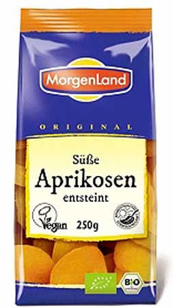 | Verwendung | Der fruchtige Geschmack der MorgenLand Aprikosen macht sie zur Delikatesse für zwischendurch. Getrocknete Aprikosen passen auch prima ins Müsli, in Gebäck, Frucht-Smoothies und in leckere Desserts. |