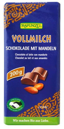 Zartschmelzende Vollmilchschokolade mit knackigen Mandeln - fair gehandelt von Rapunzel HAND IN HAND-Partnern. Das intensive Conchieren ist neben den wertvollen Rohstoffen das eigentliche Geheimnis des wahren Schokoladengenusses. Durch die Kunst des Conchierens entwickelt sich der anfänglich noch verborgene Reichtum an kakaoeigenen Aromen Stufe um Stufe bis zur vollen Entfaltung. Gleichzeitig entsteht vollkommene Feinheit und der unvergleichlich zarte Schmelz.